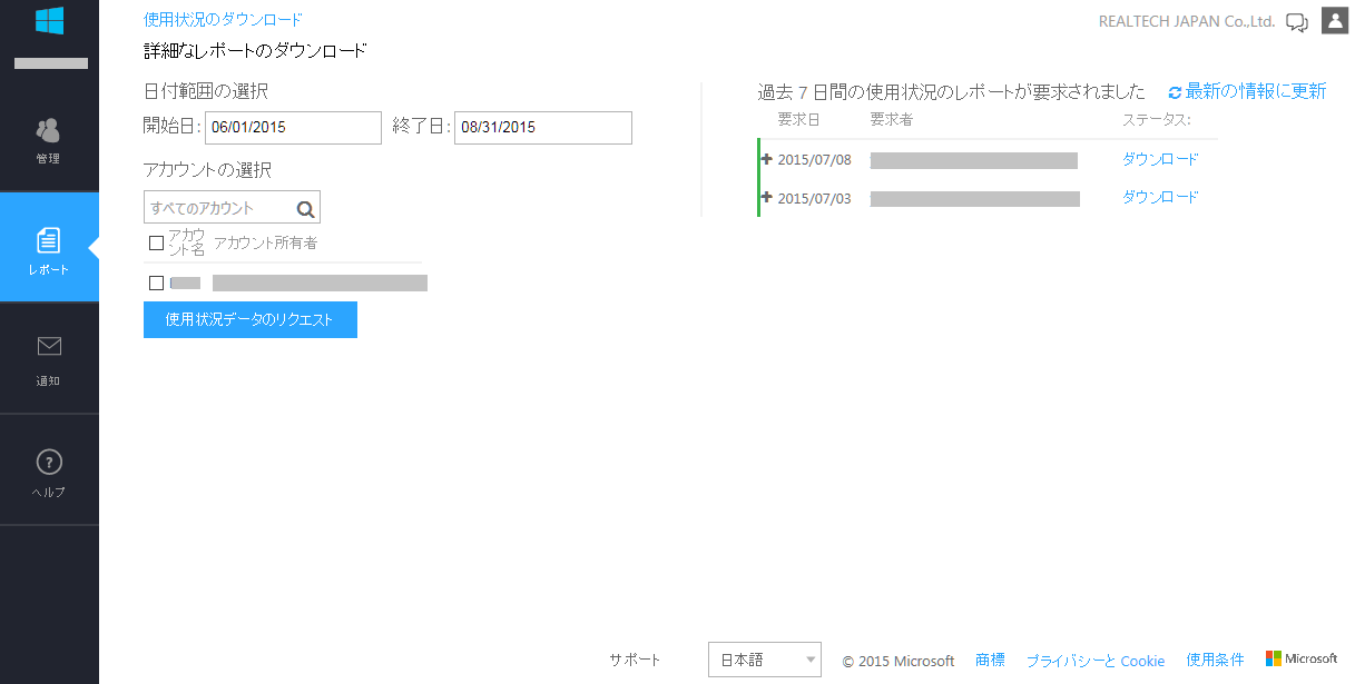 ところで、EA契約を前提とした場合に「Azure管理ポータルで確認できるのは利用量まで」と先にご説明しておりましたが、参考までに実際に取れるデータを見ておきましょう。今回はアカウントオーナーの管理ポータル(Azure Enterprise Portalea.azure.com)のレポート画面からダウンロードすることになります。ちなみにレポートはバッチ処理で流れるため、リクエストを出して、後からダウンロードする流れになりますので、すこし面倒です。