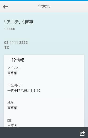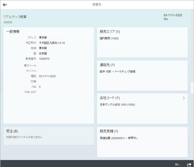 上がPC、下がスマートフォンで表示した得意先画面です。得意先画面に名前などの情報はもちろん、見積伝票、連絡先(顧客担当者)などの情報がタイル形式でまとまっています。今は表示されていませんが、販売契約伝票・請求伝票なども表示できます。各タイルをクリックすることで詳細画面に遷移します。また、右下の「開く」を押して銀行支払承認処理など関連する画面へシームレスに遷移できます。