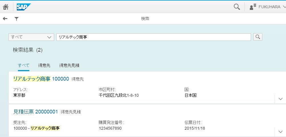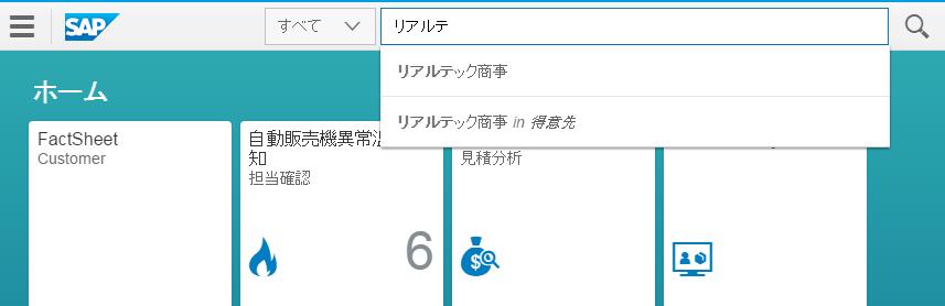 Google検索のような感覚で得意先を特定します。Fiori Launchpadと呼ばれるホーム画面から検索をします。文字を途中まで入力した時点で補完候補自動提案もされます。また、今回は「検索」からスタートしていますが、ユーザの担当得意先をタイル(ブックマークのようなもの)にして、そこから直接Fiori Factsheet画面に遷移することもできます。