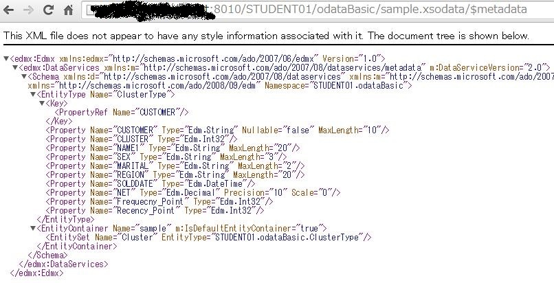 XSエンジンの中身は基本的にODataサービスとWebリソースの2つです。WebリソースはSAPUI5やサーバサイドJavaScriptです※。ODataは実際に下記のような形でブラウザで見ることができます。その特徴は「【第1回】SAPUI5とSAP NetWeaver Gatewayによるマッシュアップ開発入門(序章)」で解説したSAP NetWeaver Gatewayでも使用されているRestfulなインタフェースです。詳しくはリンク先を参照ください。今回はブラウザを通して見ていますが、実使用時は当然ODataに対応したツールで参照する形になります。
