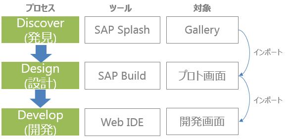 「Discover」に続くプロセスとして「Design」があり、SAP Buildがその役割を担い、「Develop」を担当するWeb IDEに続きます。この3者は連携をしていて、SAP SplashのGalleryで見つけた画面をSAP Buildにインポートして、Buildで更新した画面をWeb IDEに繋げることができます。