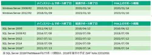 WindowsおよびSQL Serverのサポート期限について整理すると下表のようになっています。PAMとは、Product Availability Matrixの略称でSAP社が定義するサポート期限が記載されています。